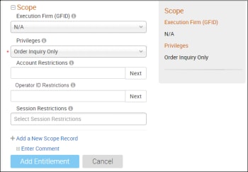 In the Privilege field, select the entitlement to assign to the user(s). Execution Firm (GFID), Privileges, Account Restrictions, Operator ID Restrictions, Session Restrictions that the user can view / manage; no entry (blank) entitles the user to access all available data. See |