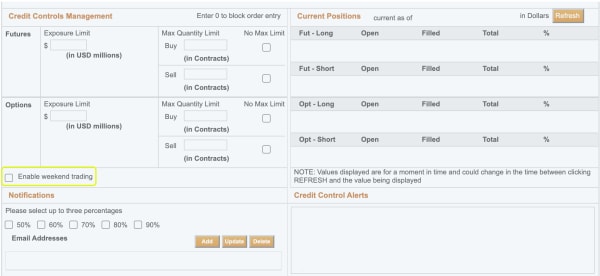When unchecked, limit values (Exposure and Max Quantity Limit) will be set to zero (0) for the weekend. Before the next weekday trading session begins, limit values will automatically revert to the previous weekday value.