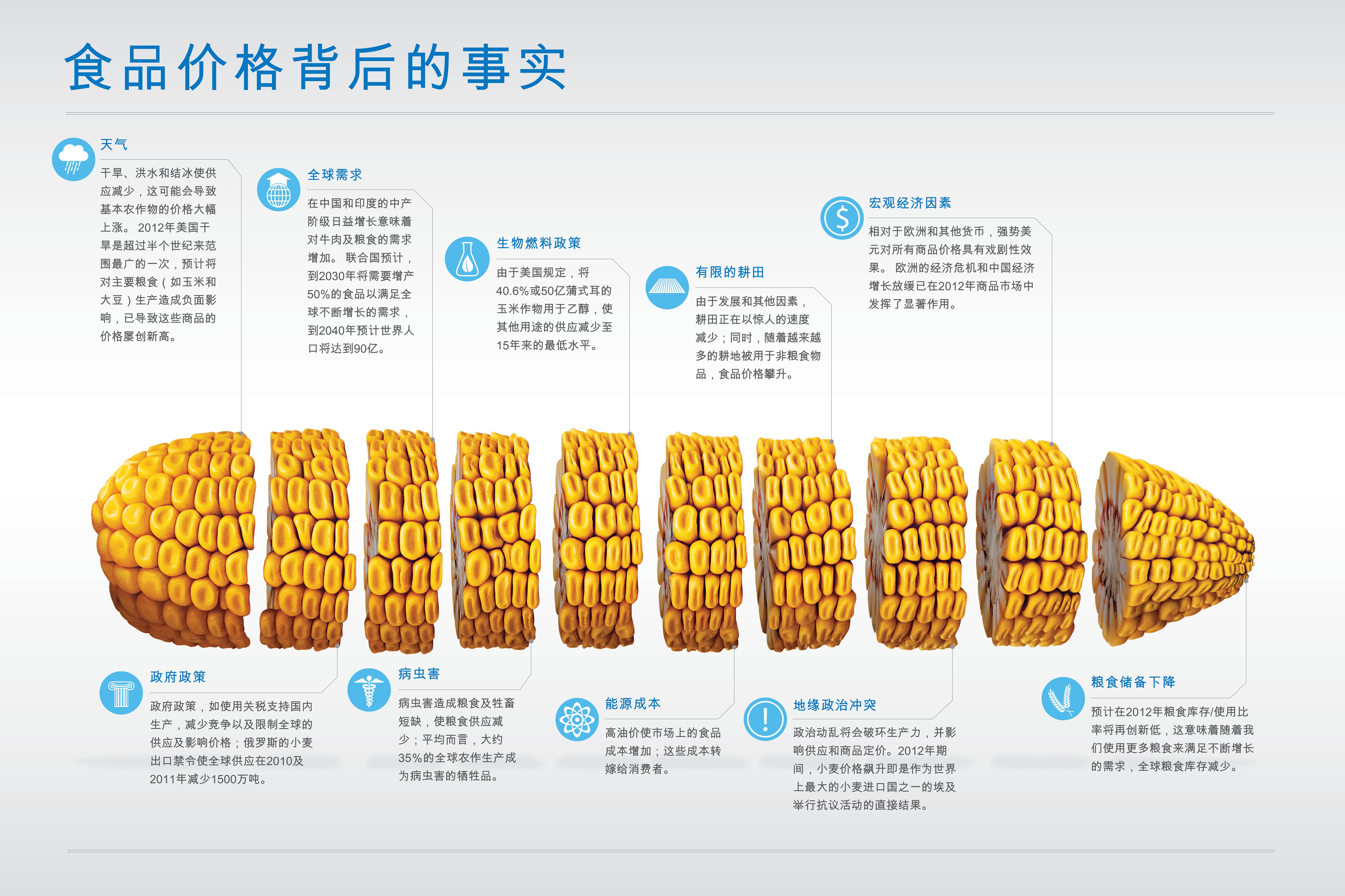 此信息图示形象化地强调了多种因素,这些因素可以影响农业市场和最终消费者支付食品的价格。 其中的因素之一是全球中产阶级日益增加,特别是在中国和印度,导致对肉类和粮食的需求增加。 事实上,联合国预计,到2030年将需要增产50%的食品以满足这些日益增长的需求。