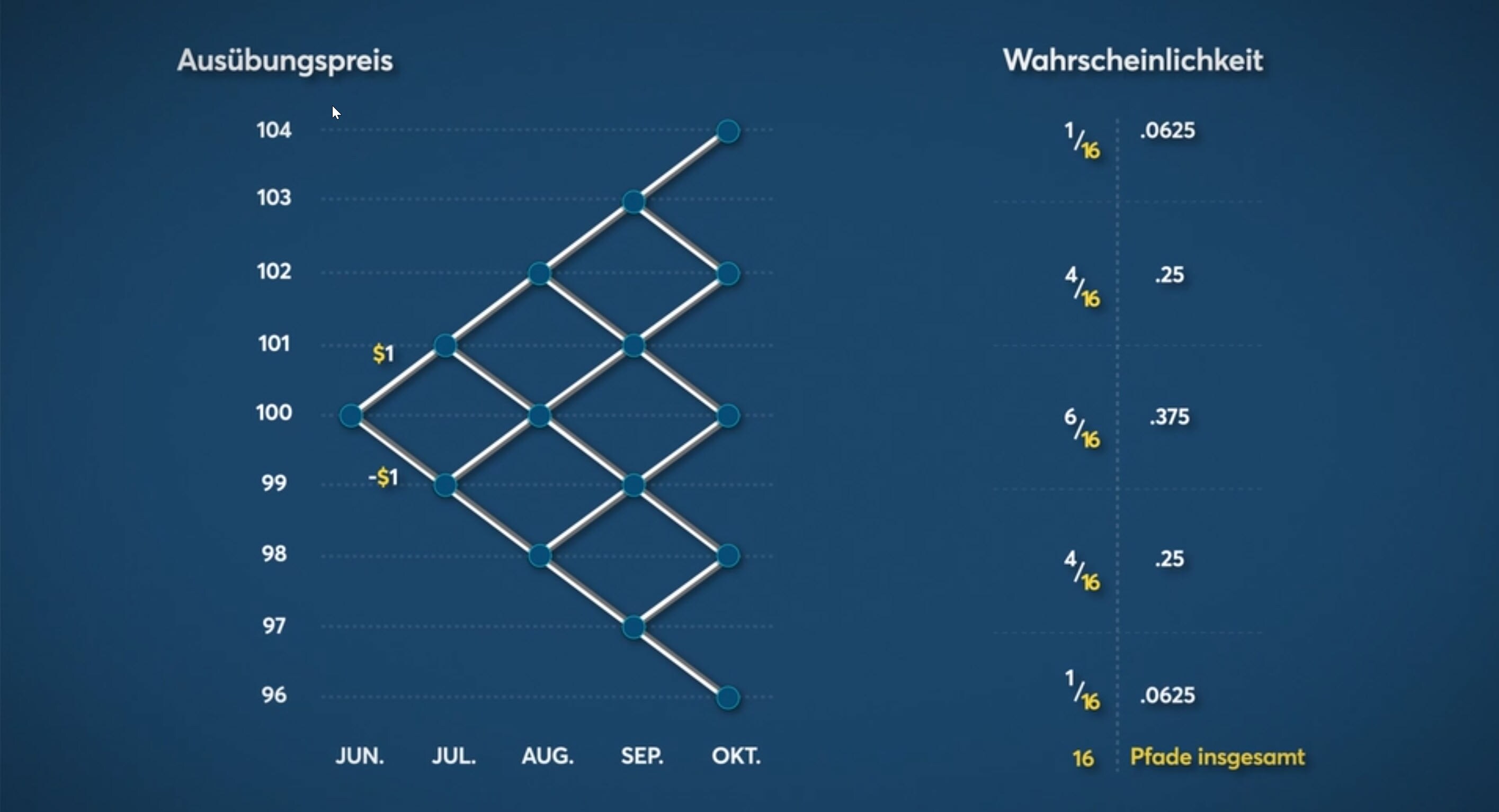 Wie hoch ist die Wahrscheinlichkeit für jedes der möglichen Preisergebnisse nach vier Monaten? In diesem Modell gibt es 16 mögliche Pfade, die zu jedem der fünf Preisergebnisse führen. Die Wahrscheinlichkeit jedes Ergebnisses kann durch Aggregation der Pfade für jeden Preis berechnet werden.