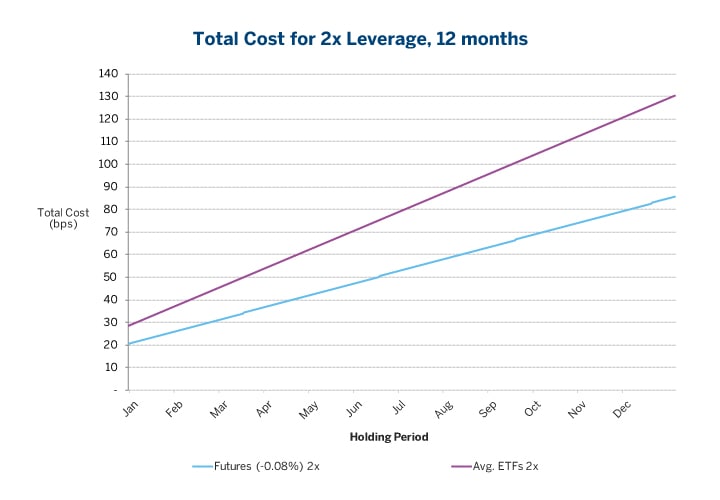 Figure 2 shows that as a function of leverage, the total cost associated with futures will never exceed that of the ETFs. For the 2x leveraged investor, the ETF holding cost has increased by 44bps per annum more than the futures due to above-ICE LIBOR rates charged on borrowed funds by a prime broker. Consequently, futures are more economical across all time horizons at the 3mL and roll levels observed at the time of the analysis.