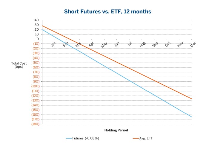 As evident in the Figure 1, there is no breakeven point in which the ETF becomes more cost-effective than the futures over the 12-month holding period. In fact, the futures would remain the more cost-effective vehicle in perpetuity as the net impact of the quarterly roll execution costs (0.2bps per leg) plus implied financing (3mL -8bps) incurred on the futures is less than the annual management fees charged on the ETFs.