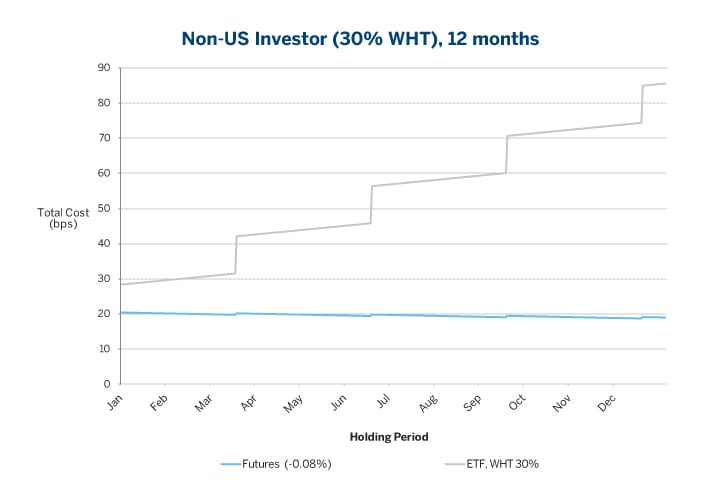 Figure 4 shows the holding comparison for a fully-funded long position (Scenario1) as experienced by a non-U.S. investor based on a 30 percent withholding. The jump in the purple line illustrates the impact of the withholding tax for the ETF holder, and the futures is the more cost effective product in perpetuity.