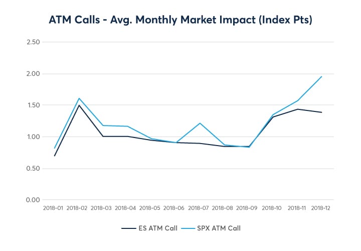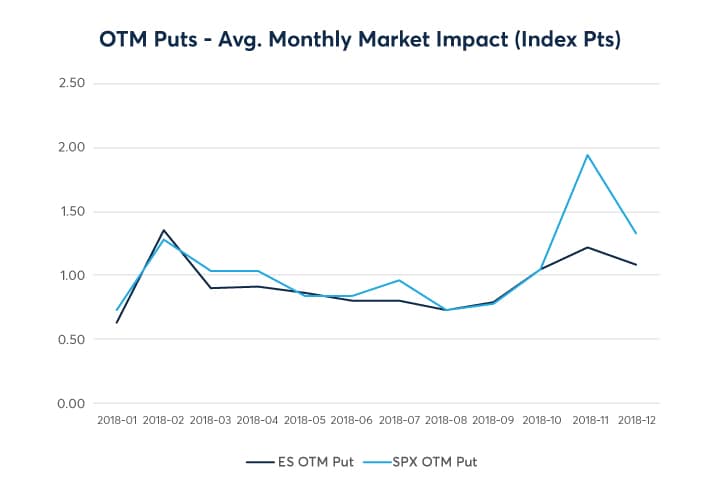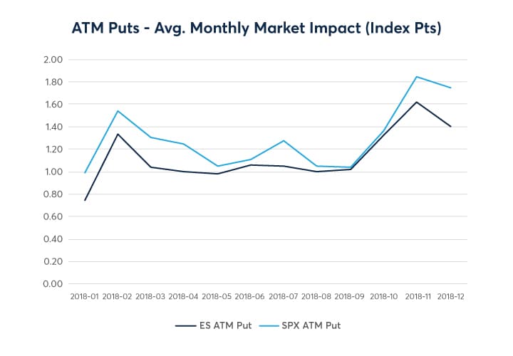 ES options offer superior execution of between 0.04 to 0.15 index points, on average, relative to SPX options. This translates to cost savings of $4 to $15 per contract. Figure 1 summarizes the results of this analysis. Investors are reminded that the results in this analysis are based on the stated assumptions and historical data. The actual costs incurred by an investor will depend on the specific circumstances of both the investor and the particular trade scenario including the instrument, option type (put/call), order size, maturity, broker fees, execution methodology, time of execution, and general market conditions, among other factors. Investors should always perform their own analysis.