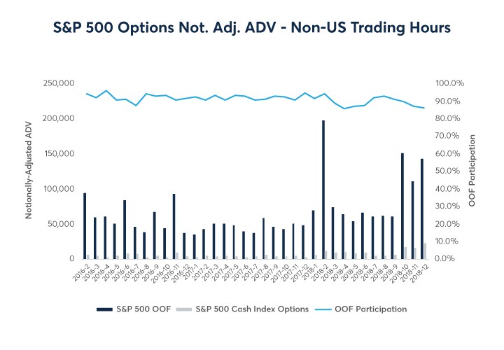 ES options offer liquidity for nearly 24 hours of the day. Looking only at ES and SPX options, over 90% of average daily volume8 during non-U.S. regular trading hours occurs in ES options. Around-the-clock liquidity in ES options can allow investors to manage their risk and prepare for market fluctuations around-the-clock. The chart below compares S&P options on futures (OOF) and S&P cash index options ADV outside of regular U.S. trading hours.