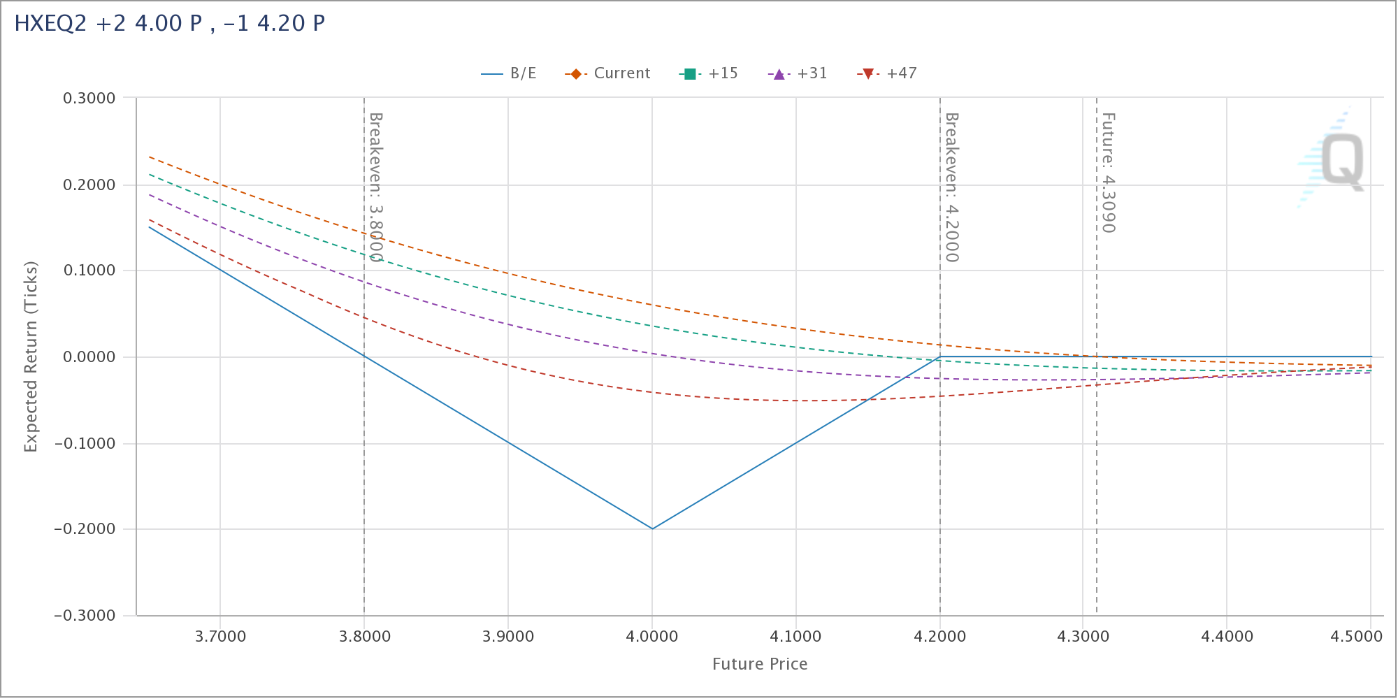 Figure 6 Payout Diagram of HXEQ2 +2 4.00 P, -1 4.20 P Ratio Put Spread