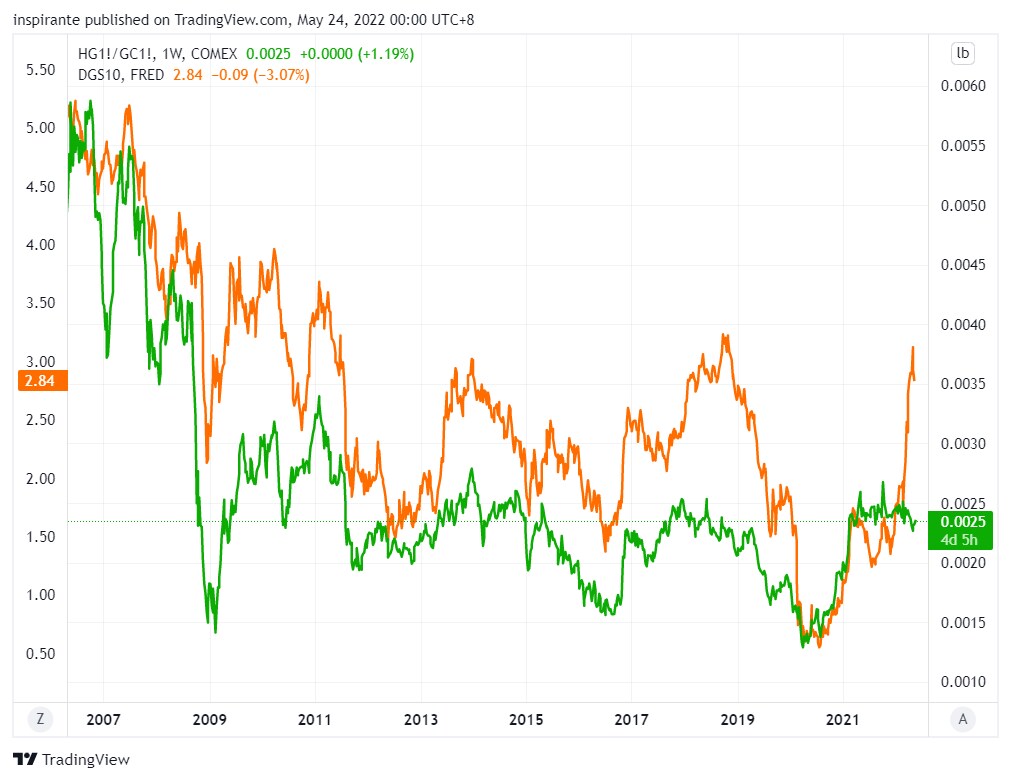 The global economy has just experienced one of the fastest recoveries in history, and many countries are now facing high-flying inflation that is getting out of hand. Central banks are stepping hard on the brakes by tightening the financial conditions to curb inflation. Aggressive tightening, however, puts the global economy at the risk of falling into recession, which would lead to lower bond yields and a lower copper/gold ratio.