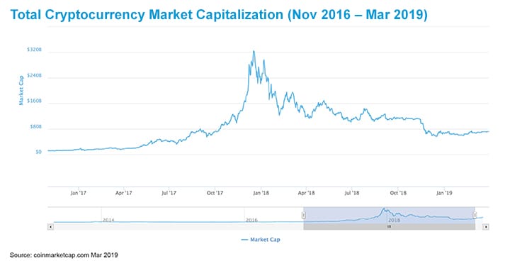 The digital asset market capitalization has grown substantially relative to 2016 and currently stands at c.$175B (Mar 2019). The number of cryptocurrencies is now a staggering 2100+. In 2016, when CME launched its first cryptocurrency products on bitcoin, the total cryptocurrency market capitalization was c.$11bn.