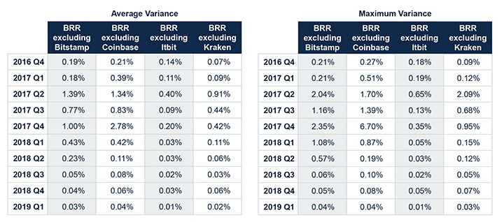 Based on worldwide BTC:USD trading volume the BRR continues to be representative of the bitcoin exchange universe. For the Q1 2019, the exchanges that contribute to the BRR capture 57% of total BTC:USD traded volume.
