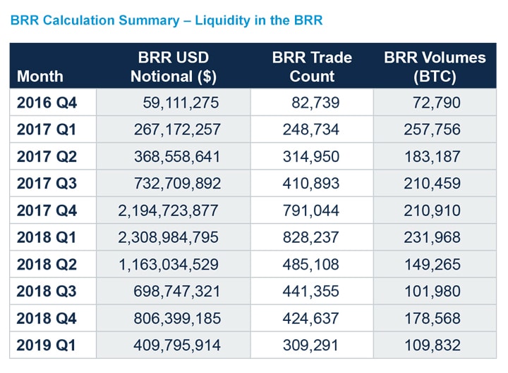 In the 1 year to March 2019, over USD 3 billion of trades were executed, over 1.8 million trades were included in the BRR based on a total of 607,000 bitcoins traded, this shows robustness in the computation of the BRR.