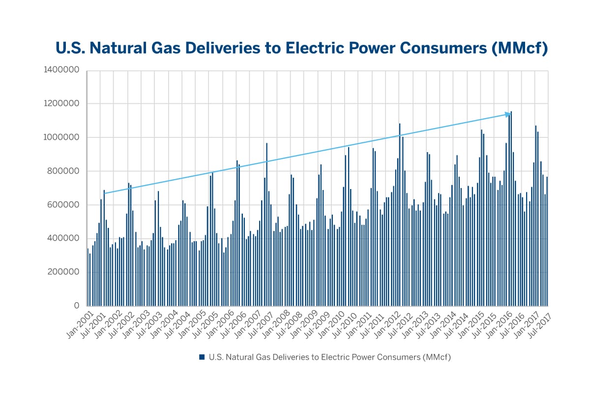 Meanwhile, natural gas prices weakened as production from the northeast Marcellus shale play started rising. The crude-gas ratio remained strong until 2014, which encouraged drilling for oil instead of natural gas. Concurrently, weak natural gas prices favorably impacted NGL economics by encouraging producers to switch to drilling more profitable NGL-rich wells. This led to the expansion of the processing industry which invested in infrastructure. From the demand side, end-users shifted their fuel preference to natural gas in order to cut costs. This shift in fuel preference is reflected through the growing trend of natural gas electricity consumption as illustrated in Figure 3.