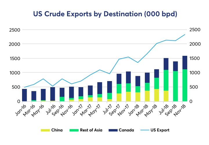 The latest data from the U.S. Energy Information Administration showed that, as of November 2018, Asia ex-China imported 1.1 million bpd, or 48% of the 2.3 million bpd of oil exported out of the U.S. As a perspective, when the U.S. Congress lifted its 40-year ban on oil exports in January 2016, Canada was the only major recipient of its 500,000 barrels per day (bpd) of oil exports.