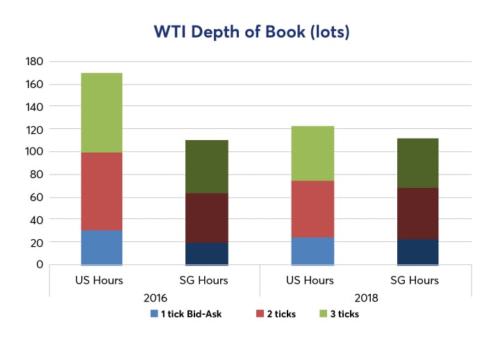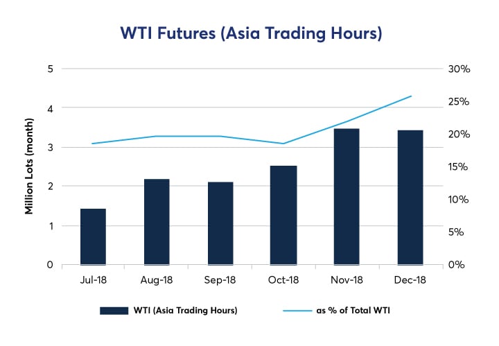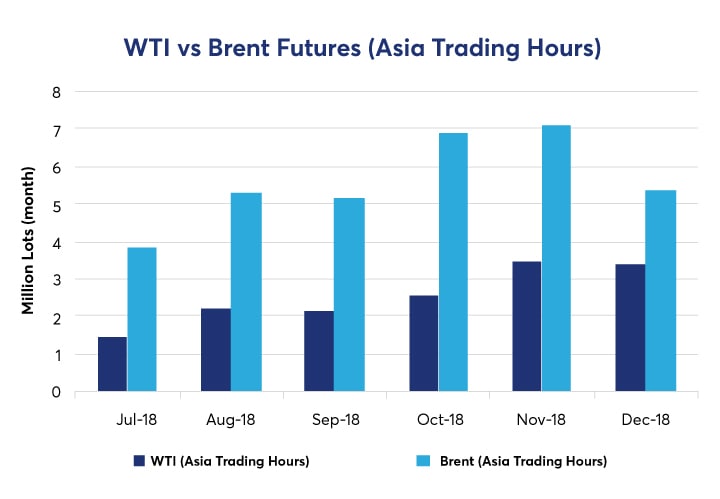 As of December 2018, total WTI futures was about two-thirds of total Brent futures volumes traded during Asia daylight hours. As such, WTI appears to be highly relevant to Asia clients.