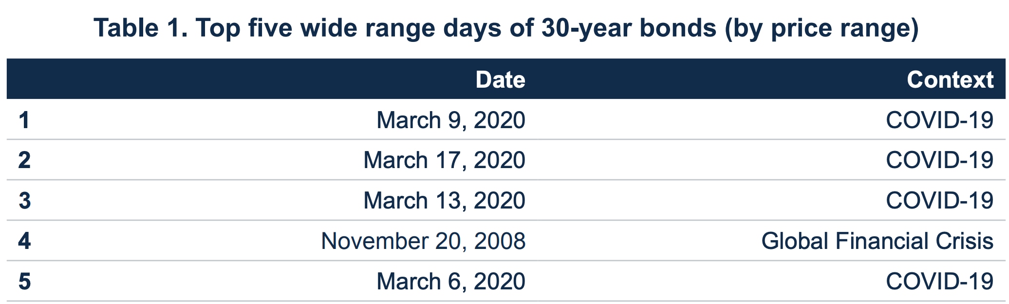 Half of the 30 wide range days seen since 2008 were observed in March 2020, indicating the unprecedented severity of the economic disruption created by COVID-19 and its attendant impact on volatility. March 2020 also included the widest price range ever observed on BrokerTec for 30-year bonds, with the intraday action reaching over 11 points on March 9, 2020