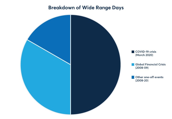 Beyond the 10 wide range days of the early financial crisis, wide range days were a relatively rare occurrence until the COVID-19 outbreak of 2020.