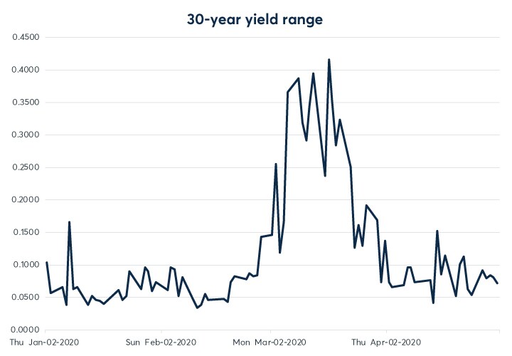 As we have seen, March 2020 saw the widest intraday price ranges ever seen for 30-year bonds. But in yield terms, the movements were less pronounced than some of those seen in previous years.
