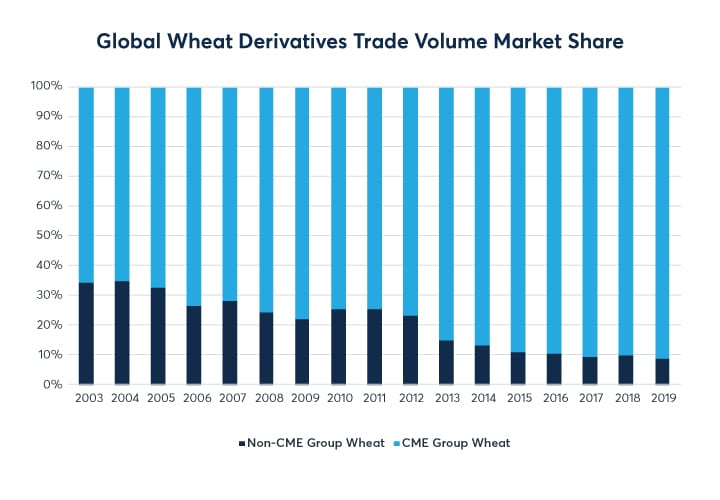 Although the traditional Chicago Wheat market share has declined, trade volume across all CME Group wheat markets has increased to account for over 90% of the today’s total wheat derivative trade volume. This comparison includes Non-CME Group exchanges, including Minneapolis Grain Exchange, Euronext, MATba (Mercado a Termino de Buenos Aires), and the Australia Securities Exchange.