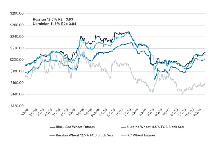 There is little surprise looking at the hedging performance of Black Sea Wheat and Australian Wheat futures for their respective markets. Black Sea Wheat futures can be a highly effective hedge for FOB Black Sea wheat cash markets, with hedge effectiveness equal to 0.93 for Russian 12.5% protein wheat and 0.84 for Ukrainian 11.5% protein wheat. With an average daily trade volume equivalent to 30,000 metric tons of wheat, Black Sea Wheat represents an effective and liquid hedging tool for price risk in the region.