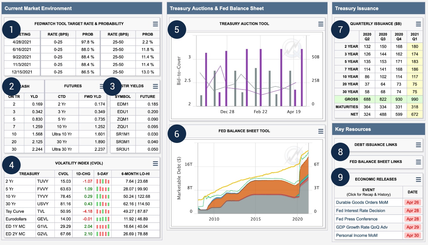 The tool organizes data into nine unique elements and further sorts the elements into four related sections. The left-most section contains important market data and prevailing treasury yields, as well as observed volatility levels in the markets. This section also includes data from CME Group’s proprietary FedWatch tool and additional key short-term interest rates markets.