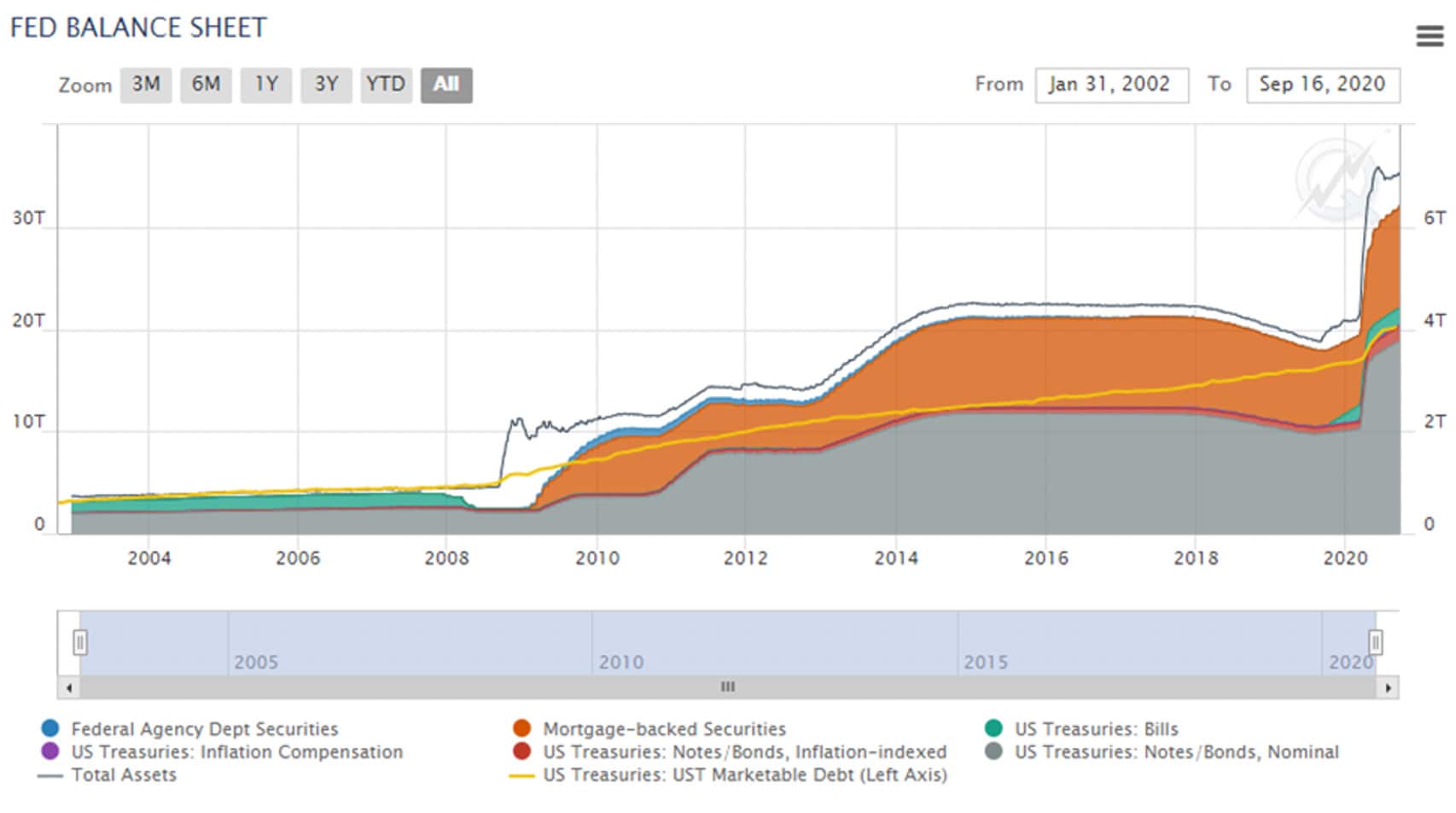 This graphical display depicts historical levels of the US Treasury Marketable Debt alongside the Federal Reserve’s Balance Sheet Total Asset Size and several key breakdowns in the Federal Reserve’s Balance Sheet Securities Holdings. Data used in this display is sourced from the US Treasury Department and the Federal Reserve.
