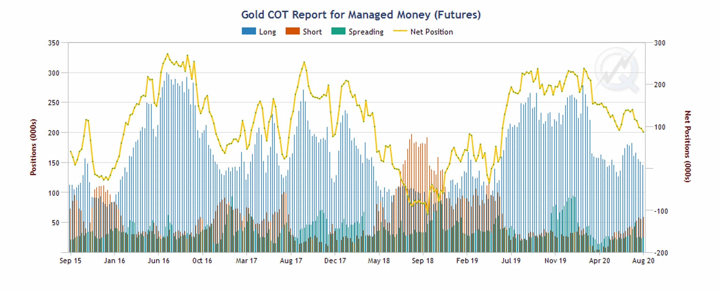 Net positioning by managed money – the category that includes hedge funds, commodity trading advisors, etc. – shows a bullish bias. Net long positions are currently at around 100,000 contracts. This is on the high side by historical standards, but certainly not at extreme levels. In fact, net long positions are below where they were at the beginning of the year, when gold was trading at $1,600. At the same time, open interest in COMEX GC futures is now on the rise. It started the year at record high levels of 800,000 open contracts and decreased to below 500,000 at its trough in early June. As of late August, it is now back to about 550,000 contracts – below the record high, but a number that is in line with the past few years.