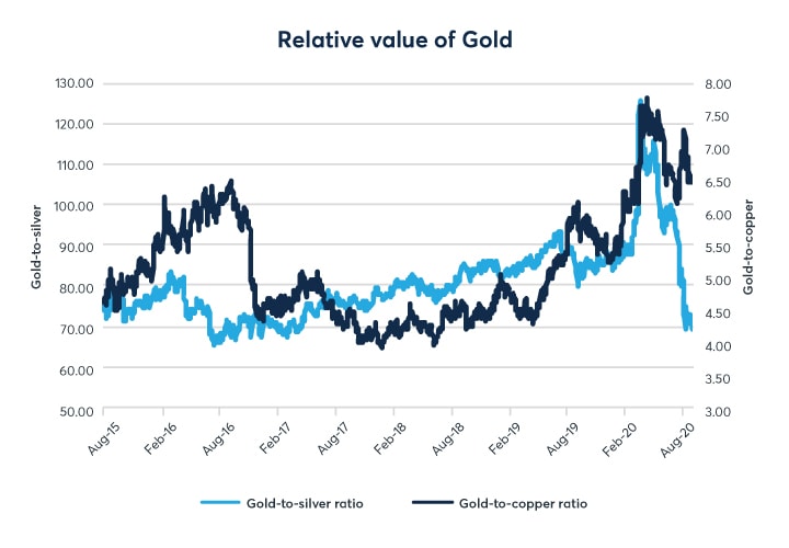 Gold is a widely accepted yardstick, and it is useful to measure its price as a ratio to other commodity assets. For instance, the gold-to-copper ratio can indicate the relative health of the world economy. Unlike gold, copper is widely used in industry and generally serves as a bellwether for economic activity. The gold-to-copper ratio has been steadily increasing since early 2018, a long time before the start of the COVID-19 pandemic. Its rise overlaps with the onset of the US-China trade conflict. The gold-to-copper ratio has now slightly decreased from record-high levels, but it remains elevated. A high ratio signals that the world economy remains in dangerous territory. In this environment, it is no surprise that gold continues to be sought after for its safe-haven appeal.