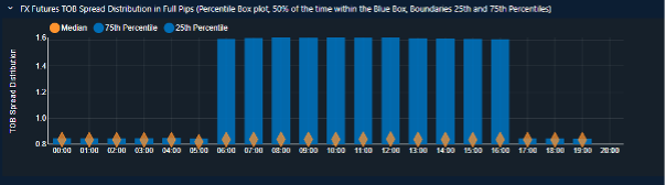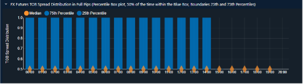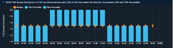 A box-whiskers (percentile) plot that buckets TOB EBS Market spreads into an hourly statistical plot. The median spread is shown in orange. The blue box highlights the range observed 50% of the time between the 25th and 75th percentiles.