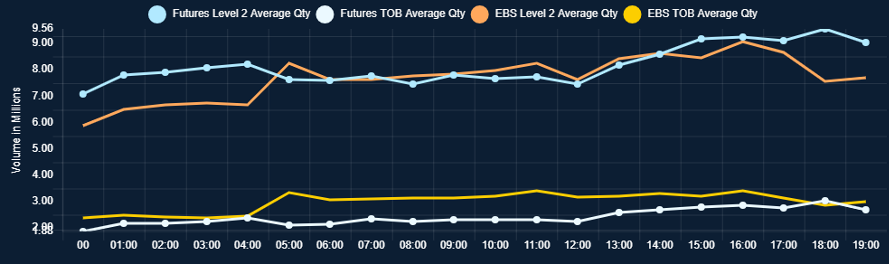 A side-by-side comparison of available EBS Market and FX futures orderbook volume for the selected orderbook levels.