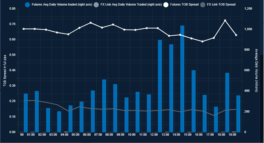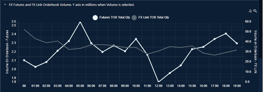 A side-by-side comparison of available FX futures and FX Link orderbook volume for the selected orderbook levels.