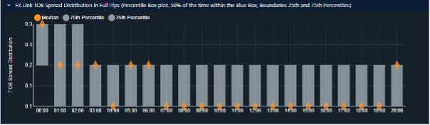 A box-whiskers (percentile) plot that buckets TOB FX Link spreads into an hourly statistical plot. The median spread is shown in orange. The grey box highlights the range observed 50% of the time between the 25th and 75th percentiles.