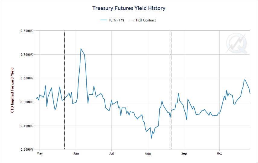 Exhibit 6: 10-Year Treasury Futures CTD Implied Forward Yield History (28 April 2020 – 28 October 2020)