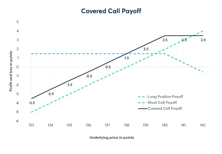 The dotted green line is the payoff profile for the bond portfolio above and below 138 in points. For each point the market increases or decreases, the P&L (in points of the long position) moves by a similar amount. The dotted blue line is the payoff profile for the short 140-strike weekly call sold for 1.5 points. The first observation is that the sale of the OTM weekly call increased the profit line of the portfolio above the existing profit line of the long only positions. That provides not only a boost to the profit, but a small amount of additional amount of income (1.5 points) if the market sells off. However, the upside for the next week is capped at a total gain of 3.5 points. Any profit above the 140-strike that the existing portfolio makes would then be paid to the long holder of the 140-strike weekly call.