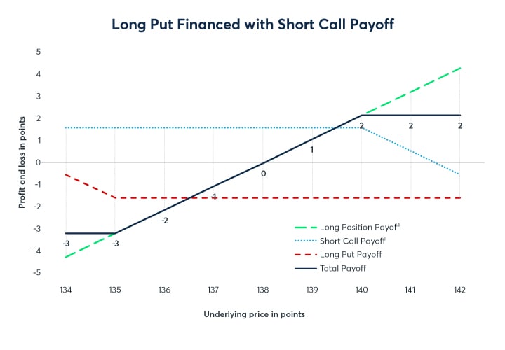 While the covered call helps with additional income, it still leaves the asset manager’s portfolio exposed to a more significant move to the downside. To manage that risk, he could purchase a long call position. As he seeks to sell the 140-strike weekly call, he can use the process of that call sale to finance the purchase of a put. In this hypothetical example, the asset manager sees he can purchase a similarly priced put for 1.5 points struck at 135. Here is how that payoff profile appears with the addition of this put purchase.