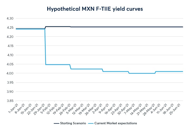 The lighter blue line represents a scenario where expectations for interest rates do fall and in fact these new expectations are realised by daily funding rates. In this situation our BONDES F value would be lower than previously. We can hedge this with F-TIIE futures.