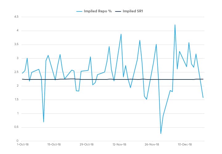 Implied Repo for Dec 2018 10-Yr Note Cash (2-7/8s of Jul 25)/Futures Basis (Light Blue)