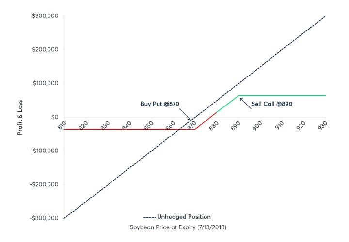 On Friday 07/06/2018, the exporter initiates a collar using Weekly options that expire on Friday 07/13/2018. At expiry, the underlying Soybean futures Aug18 price drops and settles at 814.00¢/bu following the US Administration’s announcement to impose tariffs and China’s immediate retaliatory tariffs on US agricultural goods. The sale falls through, and the exporter’s physical position of 500,000 bushels realizes a $280,000 loss in value while waiting to be loaded onto a vessel. However, because the exporter has used Weekly options to construct a collar hedge, the loss is offset with a $245,000 gain generated through the options position ($280,000 gross profit - $35,000 cost to implement the strategy).