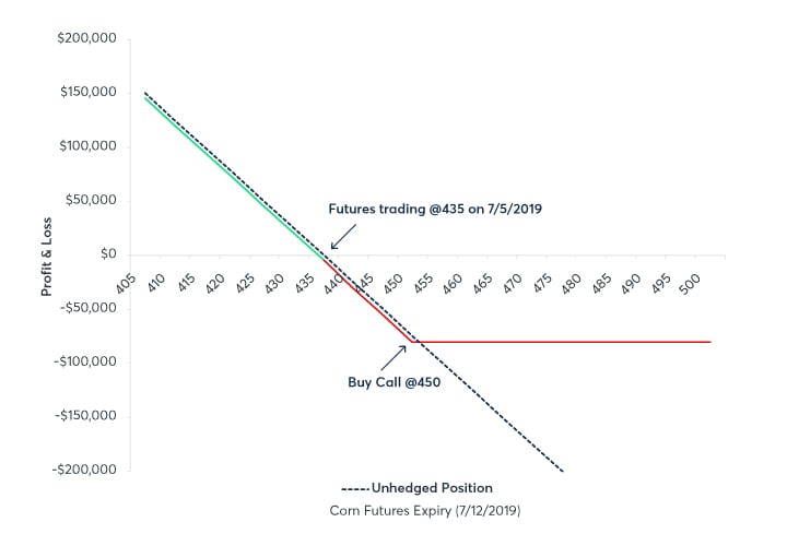 On Saturday morning, the chances of wet weather erode, with sustained high heat and sun predicted throughout the week. Over the weekend, the feed yard books an additional 500,000 physical bushels priced at the Monday close. On Monday 07/08/2019, Sep19 futures open sharply up and settle at 455.00¢/bu for a final purchase price of $2,275,000 ($100,000 more than expected on 07/05/2019 when Corn Futures were 435.00¢). However, the feed yard’s increased input costs are offset by the gain realized in the long call option.