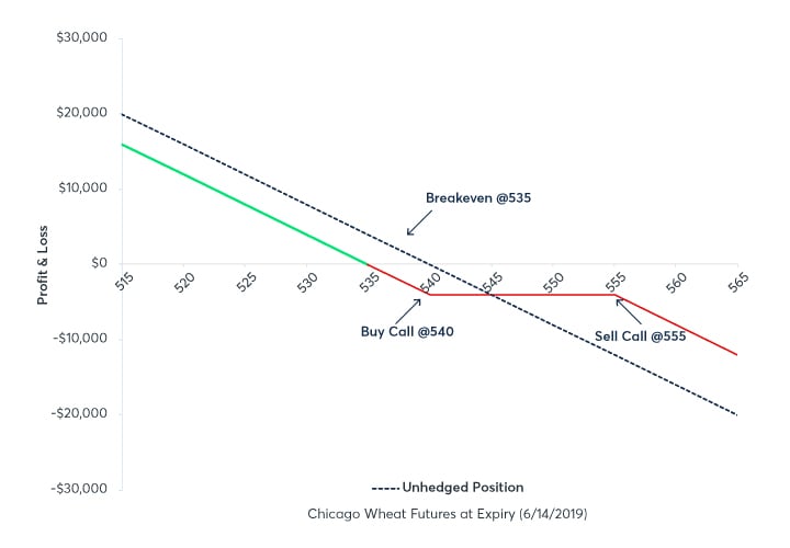 To hedge the increased purchases against temporary upside risk, the miller implements a Weekly bull call spread strategy that expires June 14, 2019. The bull call spread includes buying a lower strike call option and selling a higher strike call option with the same expiry in order to hedge against bullish market expectations. By purchasing a call spread instead of an outright call, the miller reduces the cost of the options hedge in a trade off for limited upside profit.