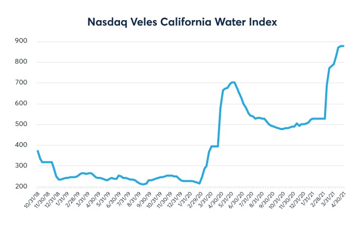 Since mid-March 2021, water prices in California have been steadily rising due to insufficient precipitation, reduced water supplies, and historically low state water and Central Valley Project water allocations. The NQH2O reflected cash water prices around $530 per acre foot in March 2021, while the price as of May 2021 has exceeded $870 per acre foot. The CME NQH2O futures settlement price is highly correlated with the NQH2O and has closely tracked the increase in water prices, as shown by the chart below.