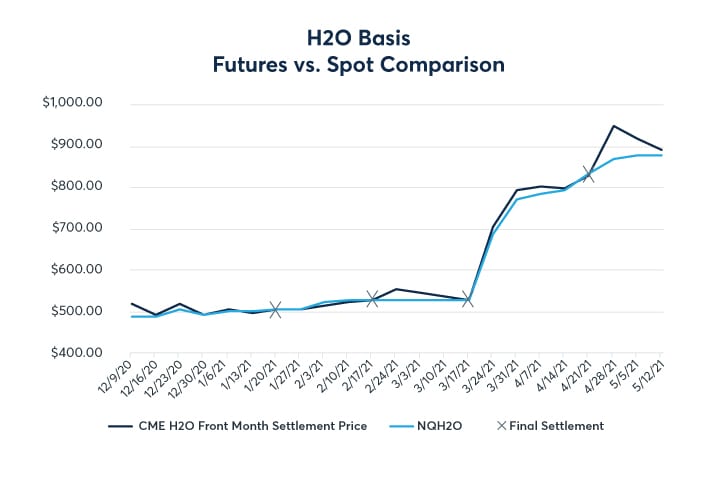 Buyers of water have been subject to this rise in water prices and now face paying over $350 more per acre foot than they were just months ago. However, any buyers who hedge their exposure using CME NQH2O futures can mitigate this risk. For example, NQH2O – here used to illustrate cash water prices – was $489 per acre foot on December 16, 2020 and climbed to $877 per acre foot on May 12, 2021. An unhedged buyer of water has lost $388 per acre foot over that five-month span, and as a result faced significantly higher prices. However, if a cash buyer of water (a long hedger) bought May NQH2O futures at $500 per acre foot in December and sold that position in May at $892 per acre foot (the futures settlement price on May 12, 2021), they would experiencea gain of $392 per acre foot. Therefore, while that cash buyer would be paying a higher price in the cash market, their futures gain helped to mitigate that loss. The water buyer would be paying $877 per acre foot in the cash market in May, but their $392 per acre foot gain in futures means that the effective price the buyer is paying for water is $485 per acre foot.