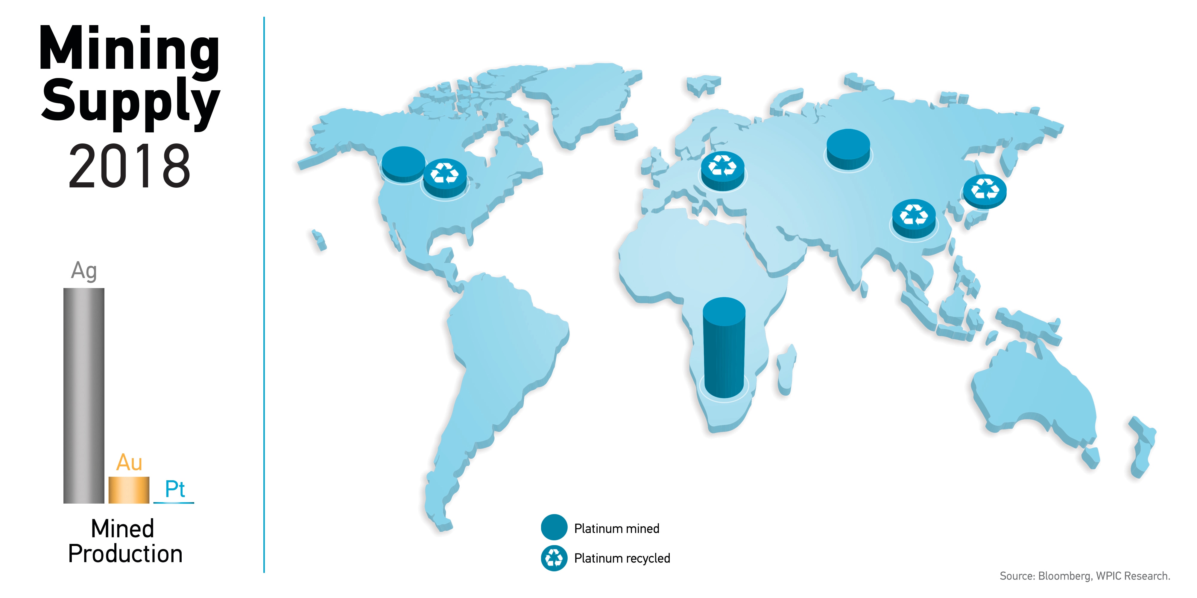 Thirty times rarer than gold, platinum is found at very low concentrations in the Earth’s crust. Platinum extraction from mining is concentrated in only three geographical locations in the world, with 80 per cent of all production in Southern Africa. Around 6 moz (190 metric tons) of platinum is mined worldwide each year, compared to 108 moz (3,300 metric tons) of gold. Each year, a further 2 moz (60 metric tons) of platinum comes from recycling, predominantly from autocatalysts in end-of-life vehicles.