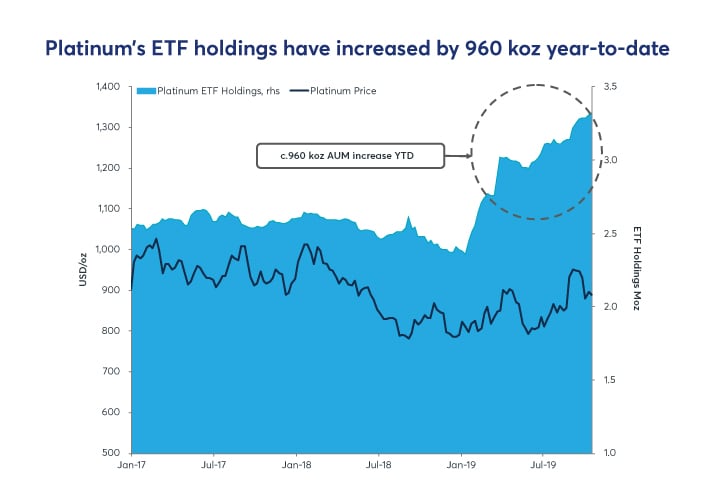 This re-reading of the platinum investment case and consequent shift in sentiment, recognising upside potential as well as inherent supply constraints, is reflected in 2019 year-to-date growth in ETF holdings, as shown in Figure 3.