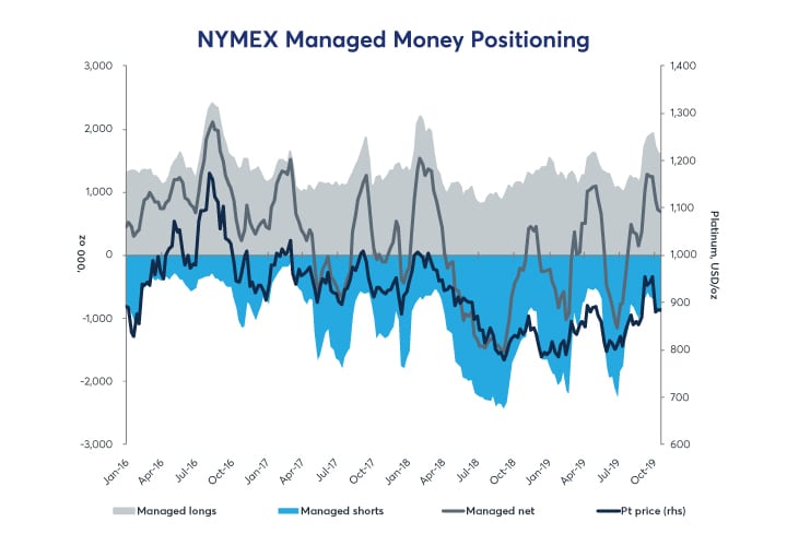 With the high correlation between the prices of platinum and gold (even after removing the effects of the USD), platinum performs much of gold’s diversification role and offers upside potential should it revert to a position where its price reflects supply/demand fundamentals that recognise upside from demand growth and its industrial value-in-use. Recent NYMEX positioning supports the view that this is beginning to happen, with recent short-term prices being positively affected by net investor positioning on Nymex (Figure 4).