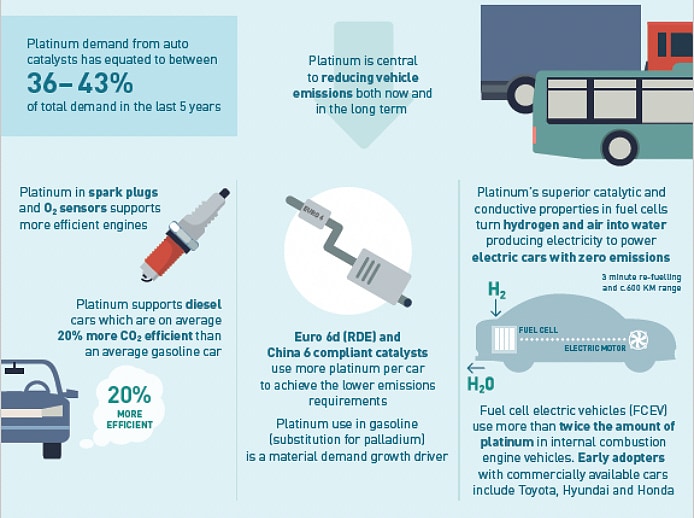 Emissions continue to be subject to increasingly strict regulations in most countries around the world and platinum – an excellent catalyst - is instrumental in reducing the three main emissions from internal combustion engines: unburned hydrocarbons (HC); carbon monoxide (CO) and oxides of nitrogen. Its sister Platinum Group Metals (PGMs) palladium and rhodium are also used in autocatalysts to control vehicle emissions. PGMs’ automotive demand is determined by the four main drivers detailed below: