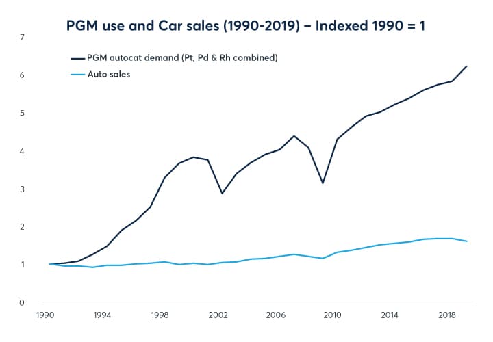 Historically, tightening emissions legislation, more than actual changes in volumes of auto sales, has driven platinum and PGM automotive demand growth. Between 1990 and 2019 annual car sales rose from c.54 m to c.92 m. but PGM use in autocatalysis rose from 2.2 moz per annum to 13.8 moz per annum.
