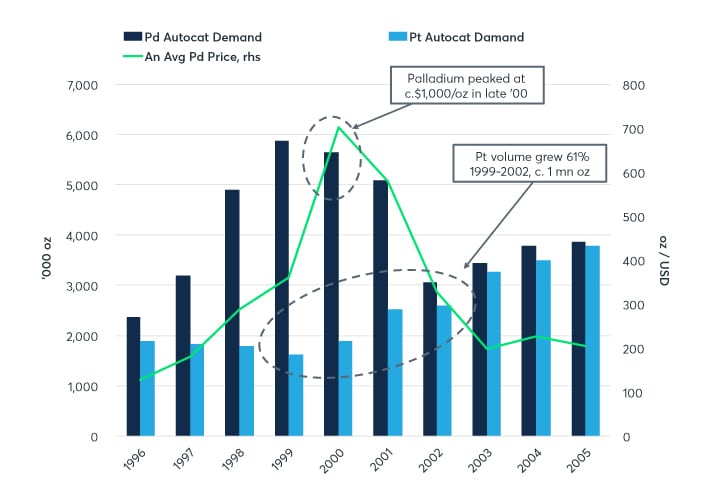 Figure 8: Palladium and Platinum auto demand vs Price, 1996 – 2005
