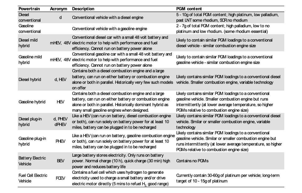3. Powertrain trends - Different powertrains (e.g. diesel, gasoline hybrid, battery electric and fuel cell electric) have significantly different loadings of platinum, palladium and rhodium. Only Battery Electric Vehicles do not contain any PGMs. Historically, diesel vehicles have the highest platinum loadings of internal combustion engine vehicles. A higher share of diesel vehicles on the road would increase platinum demand (and vice versa).
