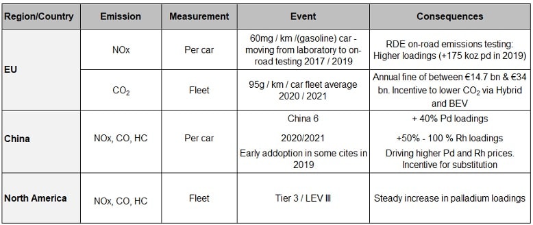 2. Vehicle sizes - Large vehicles typically have large or more powerful combustion engines and require higher amounts of PGMs per vehicle to achieve the regulated emissions levels. Historically, this relationship was broadly linear; i.e. a 1.5 litre vehicle needed about half as much PGM content as a 3 litre one did. So, a consumer trend for larger vehicles had a positive impact on PGM demand (and vice versa). This remains largely true although higher performance vehicles of similar engine size can have far higher loadings, and fear of missing regulatory compliance has resulted in ‘over engineering’. This is where more metal is used to ensure emissions regulation compliance under all conditions and is mainly due to fears after the ‘Dieselgate’ scandal in 2015 (cheating by automakers in the US) and the subsequent introduction of more stringent on-road tests that replaced in-laboratory ones.