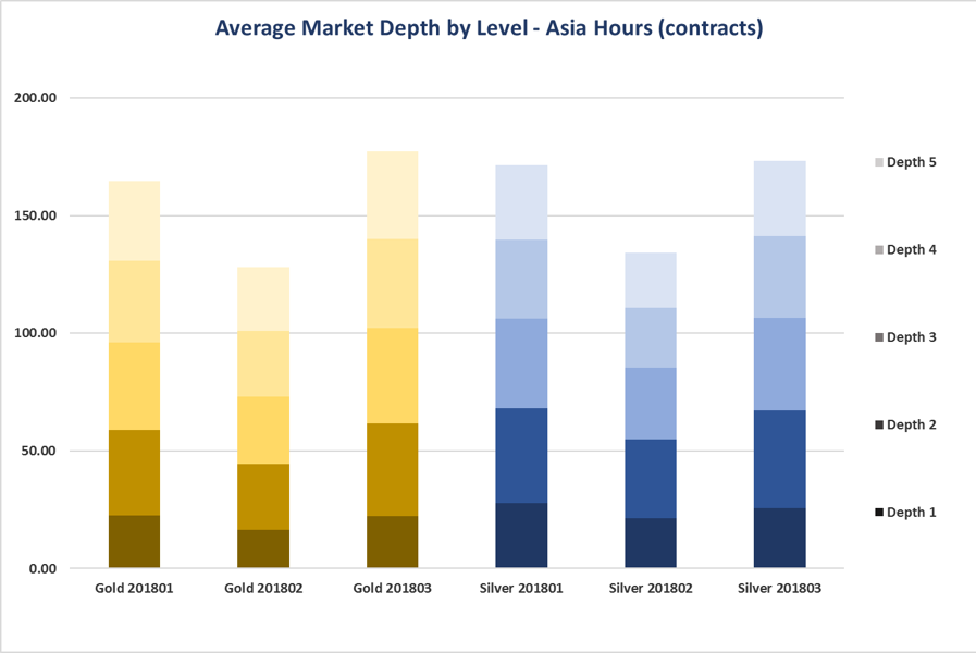 In 2012, around 190,000 lots a day of Gold futures were traded, of which less than one quarter took place during Asia hours. The average daily volume (ADV), and the proportion of Asia hours trading, have gradually increased to 380,000 lots and 35% respectively in the first quarter of 2018. For Silver futures, liquidity has hugely improved from around 55,000 lots ADV in 2012 to more than 100,000 lots in the first quarter of 2018. The percentage traded during Asia hours has also increased from 21% to 29% during that period.