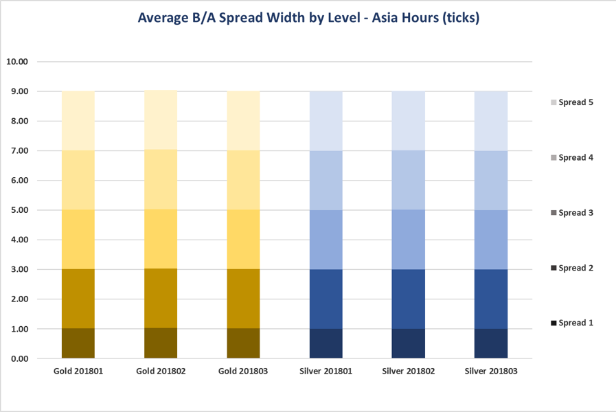 Figures 6 and 7 showed that the bid-ask spread at the best prices are consistently 1 tick wide for both gold and silver futures, and even when comparing the fifth best bid verses fifth best ask prices, the spread is only 9 ticks wide during Asia hours.